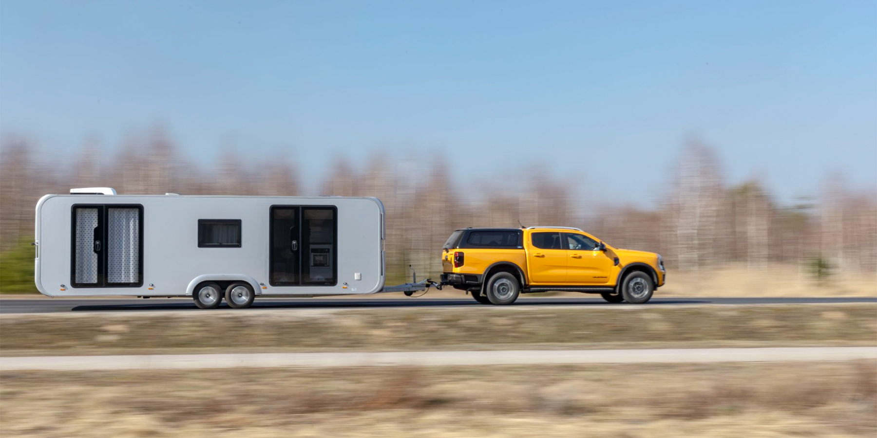 Ein solches Gespann zu bewegen, ist überraschend angenehm. Der Ford Ranger PHEV überzeugt durch seine Leistung und moderne Assistenzsysteme, darunter eine Totwinkelüberwachung mit Anpassung an die Anhängerlänge sowie eine Anhängerlichtüberprüfung. Diese Features erleichtern das Manövrieren des 9 Meter langen Luxus Wohnwagens erheblich und sorgen für ein entspanntes Fahrerlebnis, selbst auf längeren Strecken.