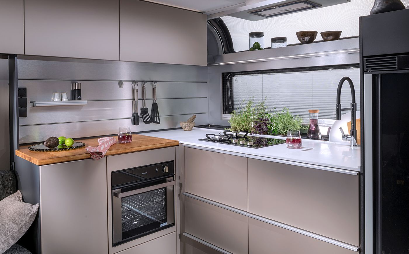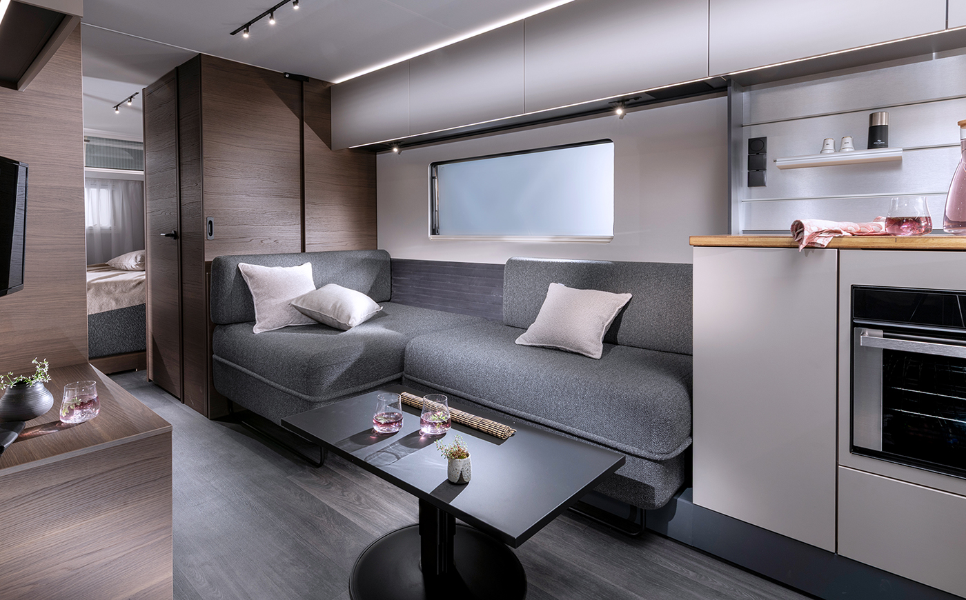 Besonders hervorzuheben sind die einzigartigen Panoramatüren bei Wohn- und Schlafzimmer. Werden sie vollständig geöffnet, verschwimmt die Grenze zwischen Innen- und Außenbereich und erzeugt einen großzügigen Terrasseneffekt: ein echtes Highlight im Bereich Luxus Caravaning.