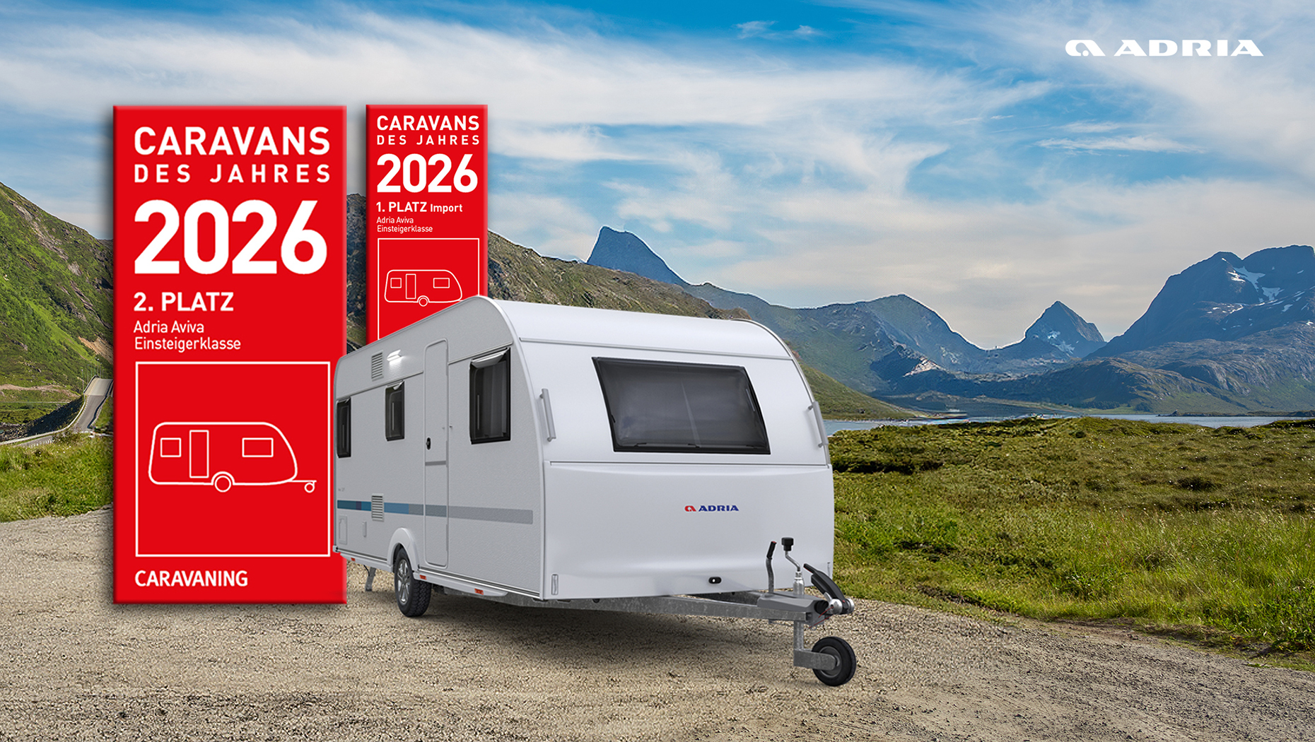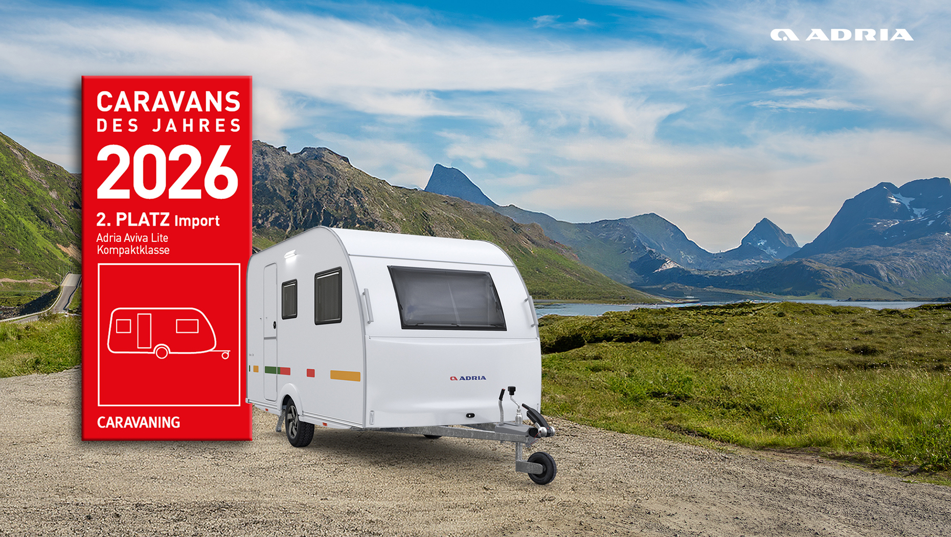 ADRIA AVIVA erreichte ebenfalls Platz 2, hier in der Einsteigerklasse, und darf sich in dieser Kategorie bester Wohnwagen 2026 in der Importwertung nennen. Damit unterstreicht er seine starke Position im Einsteiger- und Familiensegment.