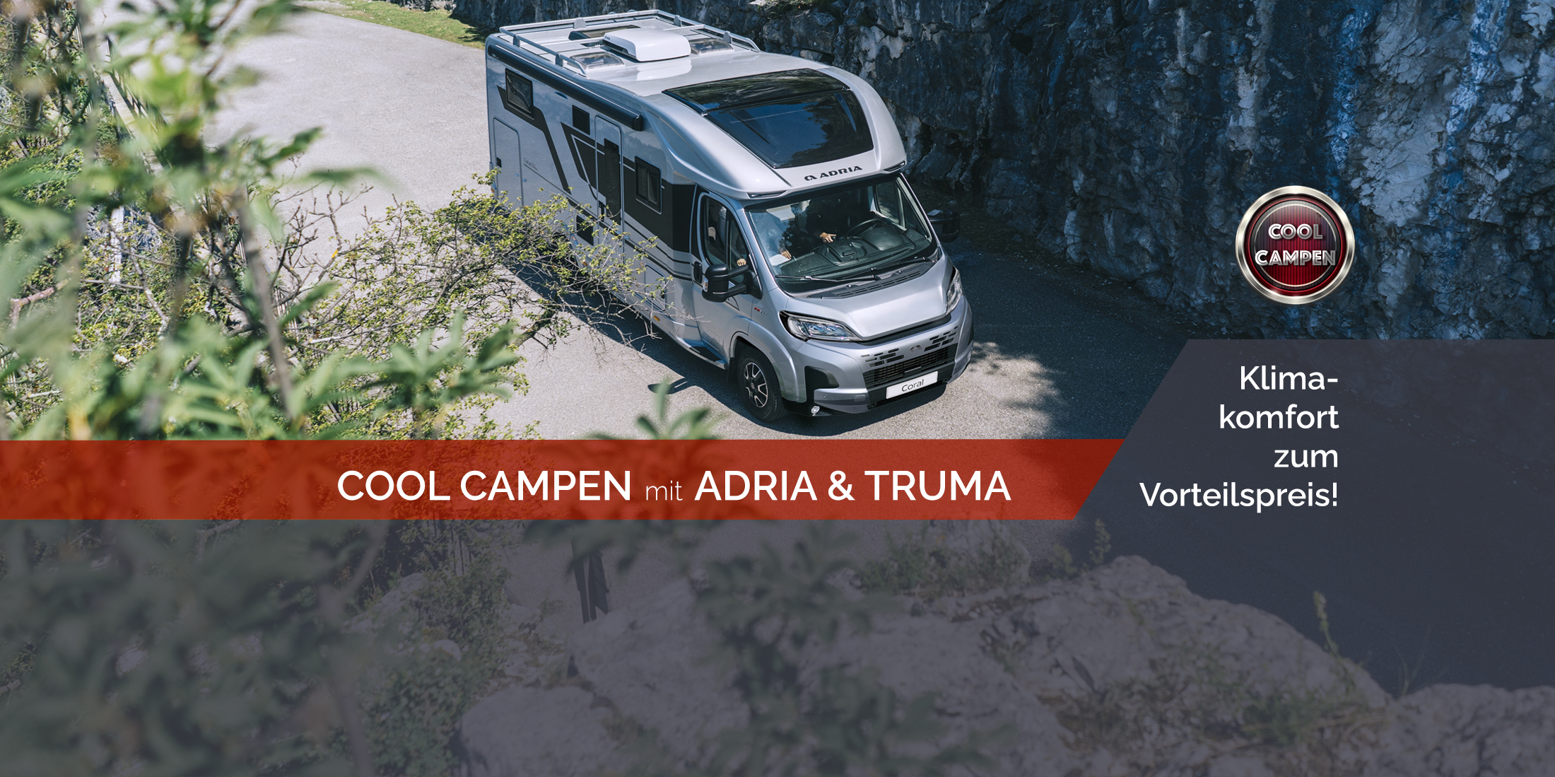 *Angebot gültig beim Endkunden-Neukauf eines ADRIA Campervans, Wohnmobil oder Wohnwagen der Saison 2025, 2024 und 2023, nur bei teilnehmenden ADRIA Händlern. Nur gültig für Truma Aventa Comfort (weiß), Aventa Compact bzw. Compact Plus (schwarz), jeweils der 1. Generation. Nur gültig, wenn der Einbau einer Truma Aventa Comfort, Compact bzw. Compact Plus Dachklimaanlage technisch möglich ist. Gültig bis 30. Juni 2025 bzw. solange der Vorrat reicht. Nicht gültig für bestehende Kaufverträge. Nicht gültig für Vermieter und Händler. Weitere Informationen erhalten Sie bei Ihrem ADRIA Händler. Alle Angaben ohne Gewähr, Änderungen und Irrtümer vorbehalten.