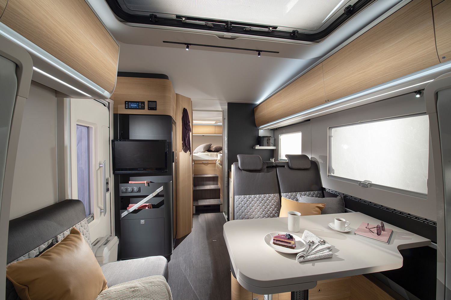 Der CORAL im Design der neuen Generation. Ein teilintegriertes Reisemobil mit dem SunRoof im exklusiven Adria Design für ein Wohnen im Atrium-Stil.